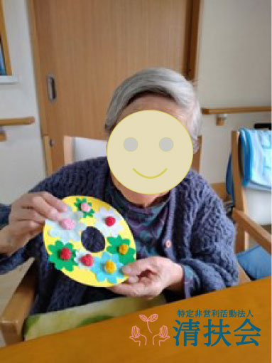 季節は春となりましたので、お花紙を丸めて花輪を作りました。思い思いに好きな色の花紙を選んで